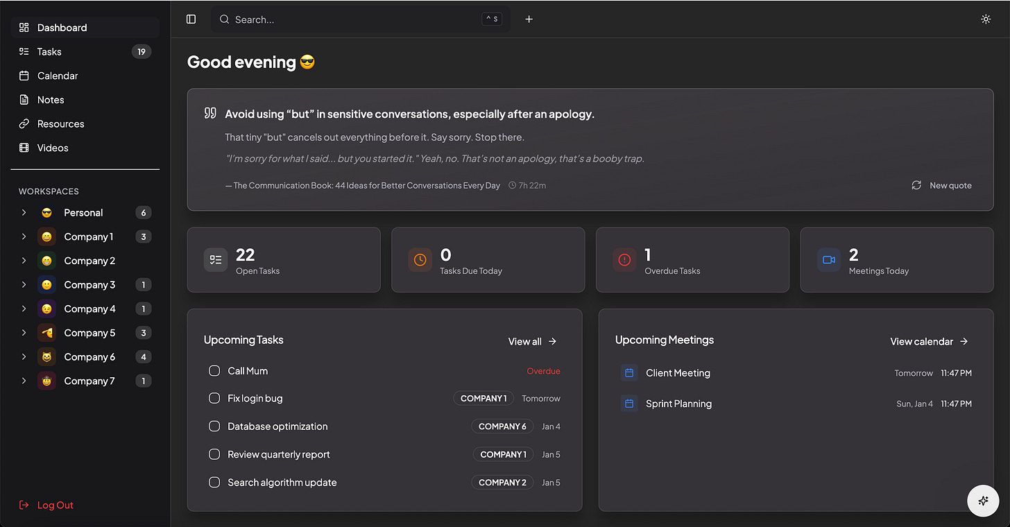 Simple: A single dashboard that has tasks, resources/links I want to keep close, notes, reminders, a video gallery, and AI functionality like a daily briefing. Oh, and it needs to connect to my WhatsApp so I can capture things on the go.