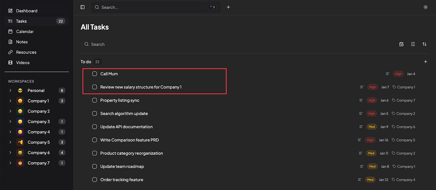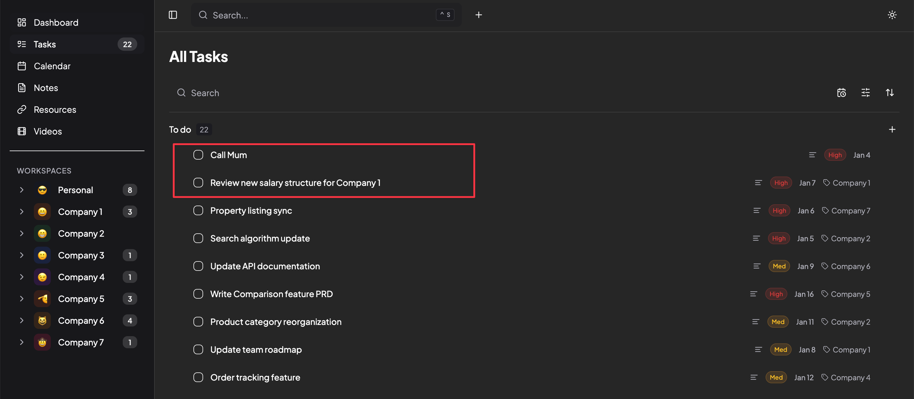 Tasks → with drag-and-drop reordering, priorities, and the ability to tag tasks to different workspaces (which is something I was unable to do with Missive).