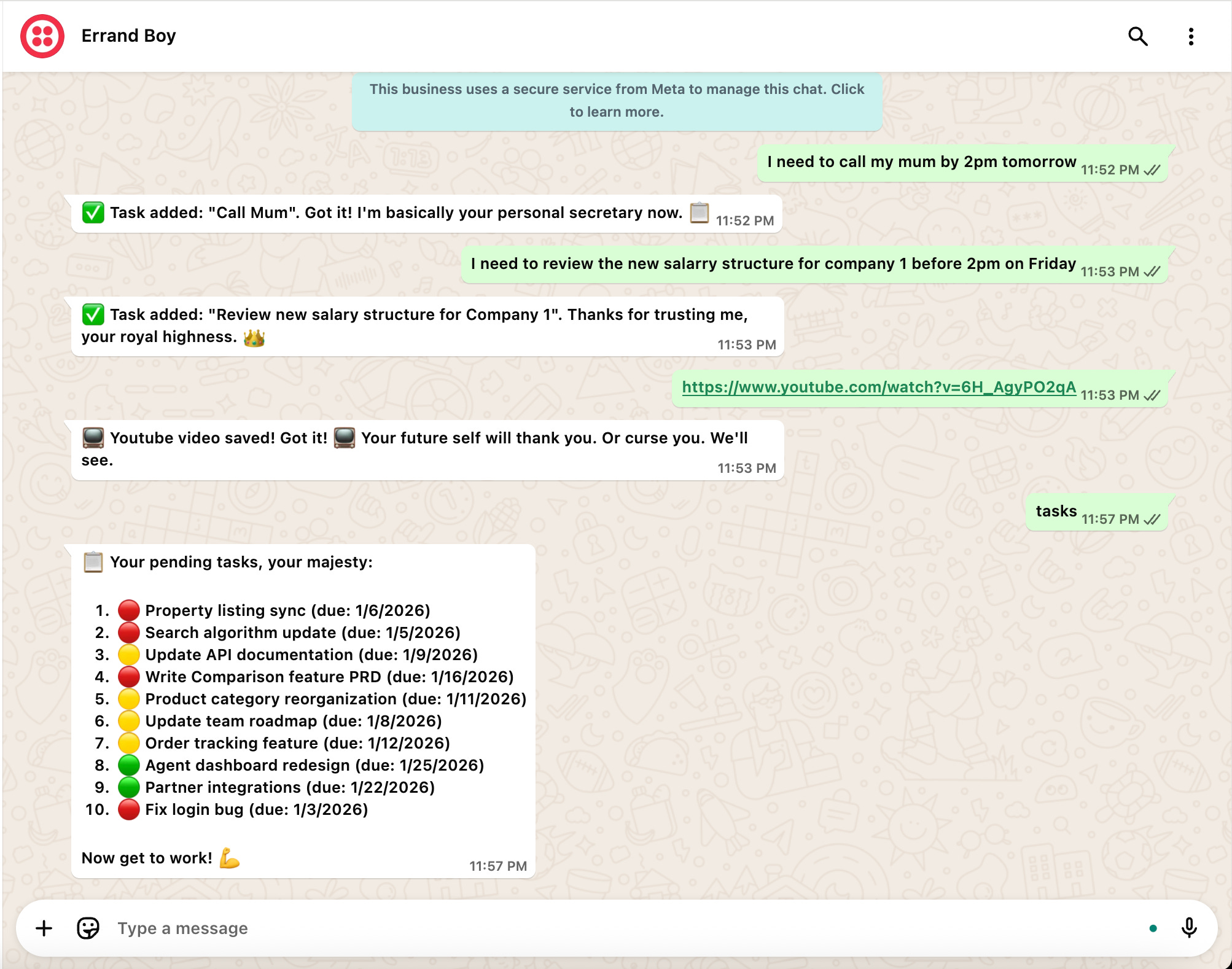 The idea is simple: I’m walking somewhere, and I remember something. Instead of opening a dashboard, I can just send a WhatsApp message like “I need to call my mum by 2 pm tomorrow”, and the AI adds it as a task and sends me a reminder at 2 pm the next day.
